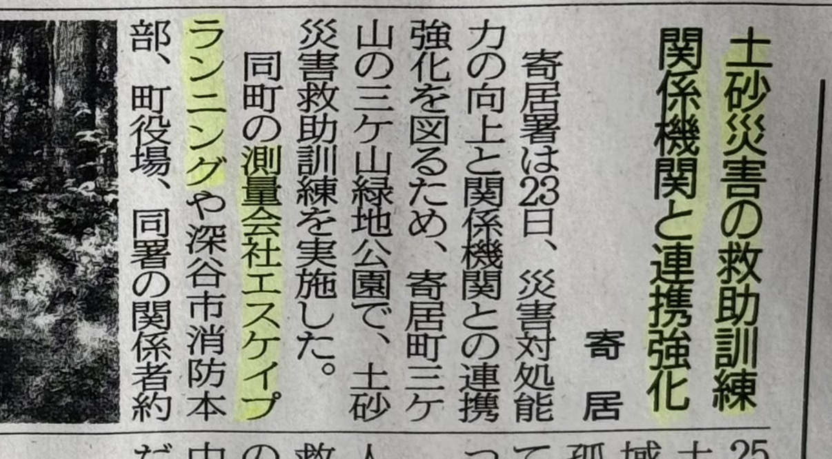 埼玉新聞掲載『土砂災害の救助訓練』 土砂災害訓練の取り組みが埼玉新聞に掲載されました。 当社は、寄居警察署と合同で実施した土砂災害を想定したドローン訓練について、 その取り組みが埼玉新聞に掲載されました。 本訓練では、災害発生時における上空からの状況把握や、迅速な情報共有を目的として、ドローンを活用した訓練を行いました。 今後も、地域防災力の向上に寄与できるよう、技術力の向上と実践的な訓練に取り組んでまいります。