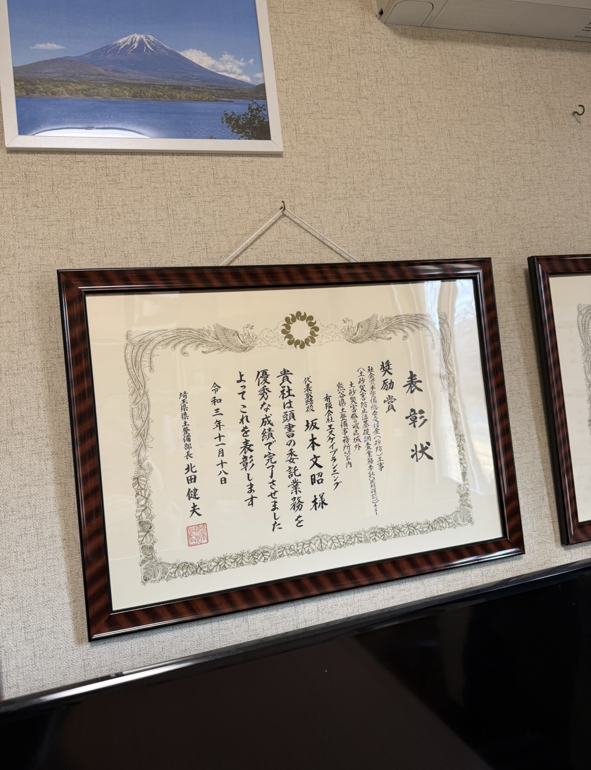 埼玉県県土整備部長より表彰を受けました 。(令和3年11月18日)